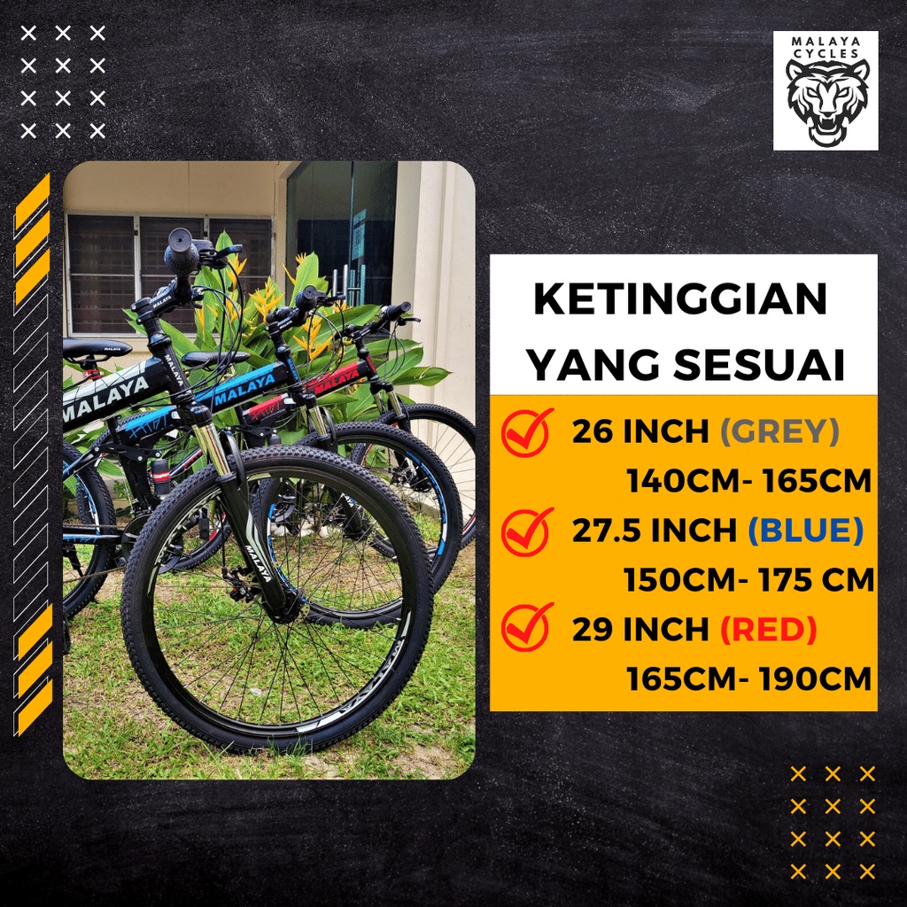 Diameter roda basikal mengikut ketinggian. Bila dah pilih basikal apa nak pakai tu baru lah kite tetapkan saiz bodyframe basikal mengikut ketinggian anda. 3- Saiz Basikal.